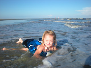 Also notice that in one of the pictures above, there is a tiny red plane. We were sitting enjoying playing with Joseph and Lily while Papa Bill was "hunting" with William and Mimi was taking a rest at the house. We noticed this red airplane flying over the ocean along the coast, right in front of where we were sitting. He kept coming back around and began doing all sorts of flips and twists and tricks. It was something to see! William and Papa Bill missed it, they were on the other side of the pond break in the beach. We had a free air show! Toward the end, we noticed the pilot had gone back up (straight up) and we both agreed it looked like he could stall from the steep climb. All of the sudden his engine turned off and he was nosediving right at where we were sitting. We both got up and grabbed Lily and Joseph. I don't think we really thought he was going to crash on us, but we were pretty sure he was about to crash somewhere. Right above us he cut his engine back on and swooped back up. It was one of the most impressive "airshows" I've seen in a while.